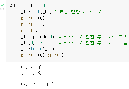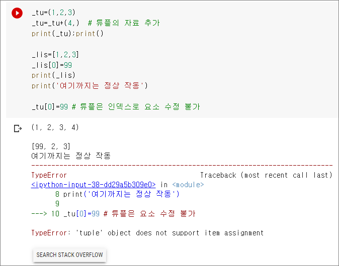 _tu[0]=99 # 튜플은 인덱스로 요소 수정 불가