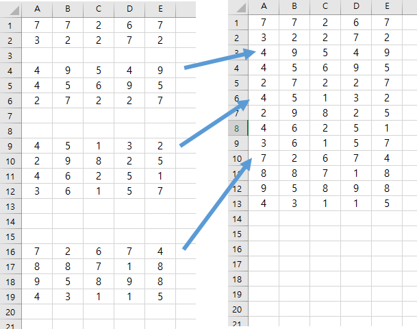 | Option Explicit Sub 빈행삭제() '방법1) Dim rng As Range Dim rBL As Range Set rng = Range("a1", Cells(Rows.Count, "a").End(xlUp)) 'a열의 입력된 맨아래 자료까지 범위 선택 For Each rBL In rng.SpecialCells(xlCellTypeBlanks).Areas '빈셀은 각각 떨어져 있는 다중영역이므로 'Areas로 받는다. If rBL.Count > 0 Then rBL.Resize(rBL.Count, 1).EntireRow.Delete 'Resize로 행전체를 선택하여 삭제한다. End If Next End Sub |