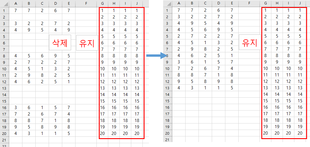 두번째) 행의 일부만 삭제하여 뒤쪽 데이터 유지