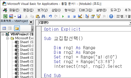 | Option Explicit Sub 교집합선택() Dim rng1 As Range Dim rng2 As Range Set rng1 = Range("a1:d10") Set rng2 = Range("c3:f8") Intersect(rng1, rng2).Select End Sub |