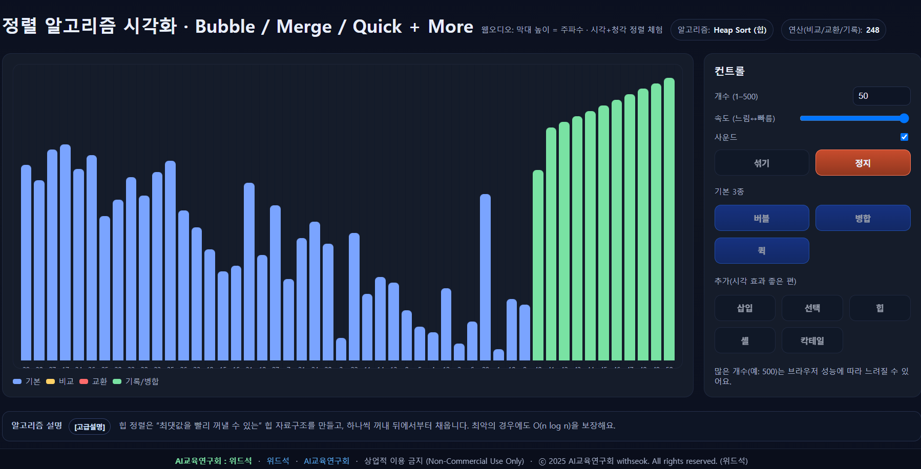 개수 (1–500) 속도 (느림↔빠름) 사운드 섞기 정지 기본 3종 버블 병합 퀵 추가(시각 효과 좋은 편) 삽입 선택 힙 셸 칵테일 많은 개수(예: 500)는 브라우저 성능에 따라 느려질 수 있어요.