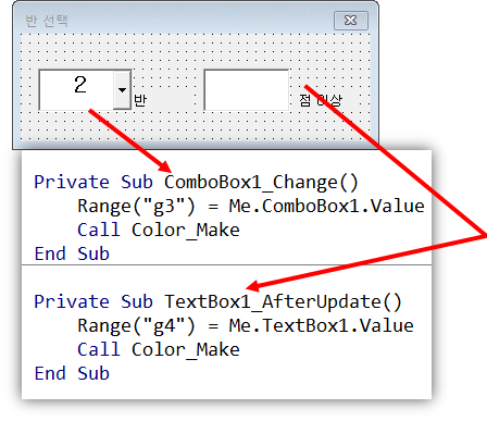 | Private Sub TextBox1_AfterUpdate() Range("g4") = Me.TextBox1.Value Call Color_Make End Sub |