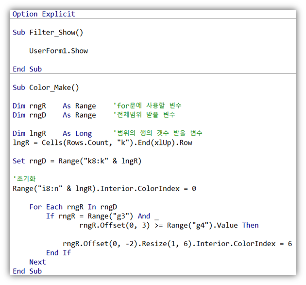 | Sub Color_Make() Dim rngR As Range 'for문에 사용할 변수 Dim rngD As Range '전체범위 받을 변수 Dim lngR As Long '범위의 행의 갯수 받을 변수 lngR = Cells(Rows.Count, "k").End(xlUp).Row Set rngD = Range("k8:k" & lngR) '초기화 Range("i8:n" & lngR).Interior.ColorIndex = 0 For Each rngR In rngD If rngR = Range("g3") And _ rngR.Offset(0, 3) >= Range("g4").Value Then rngR.Offset(0, -2).Resize(1, 6).Interior.ColorIndex = 6 End If Next End Sub |