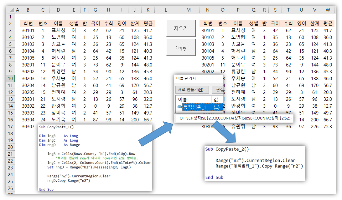 | Sub CopyPaste_2() Range("n2").CurrentRegion.Clear Range("동적범위_1").Copy Range("n2") End Sub |