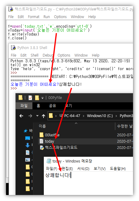 | f=open('today.txt','w',encoding='utf-8') vToday=input('오늘은 기분이 어떠세요?') f.write(vToday) f.close() |