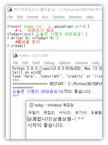 | f=open('today.txt','a',encoding='utf-8') # a : 이어쓰기 모드 vToday=input('오늘은 기분이 어떠세요?') f.write('\n'+vToday+'\n') #줄바꿈 추가 f.close() |