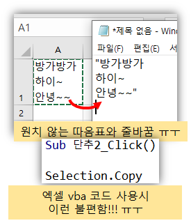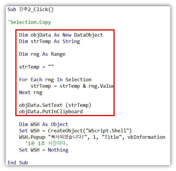 | Sub 단추2_Click() 'Selection.Copy Dim objData As New DataObject Dim strTemp As String Dim rng As Range strTemp = "" For Each rng In Selection strTemp = strTemp & rng.Value Next rng objData.SetText (strTemp) objData.PutInClipboard Dim WSH As Object Set WSH = CreateObject("WScript.Shell") WSH.Popup "복사되었습니다!", 1, "Title", vbInformation '1은 1초 시간이다. Set WSH = Nothing End Sub |