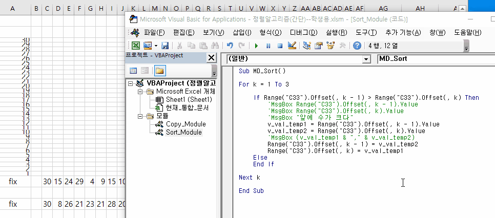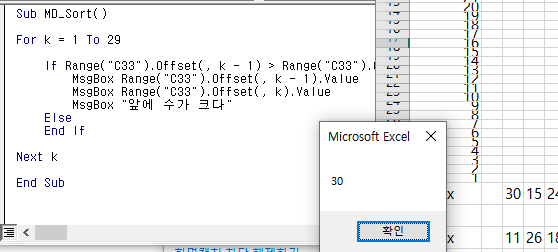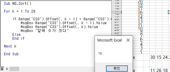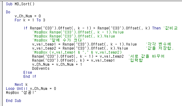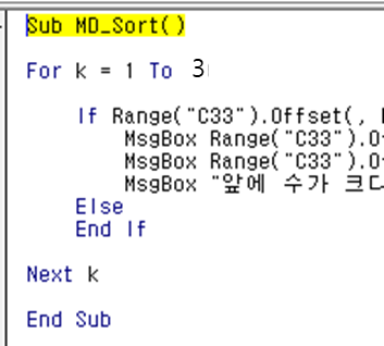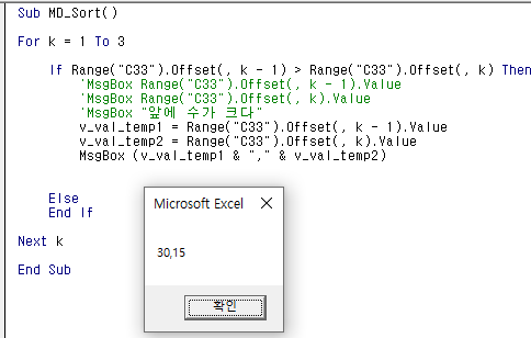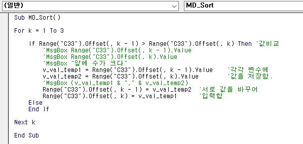 | Sub MD_Sort() For k = 1 To 3 If Range("C33").Offset(, k - 1) > Range("C33").Offset(, k) Then MsgBox Range("C33").Offset(, k - 1).Value MsgBox Range("C33").Offset(, k).Value MsgBox "앞에 수가 크다" Else End If Next k End Sub |