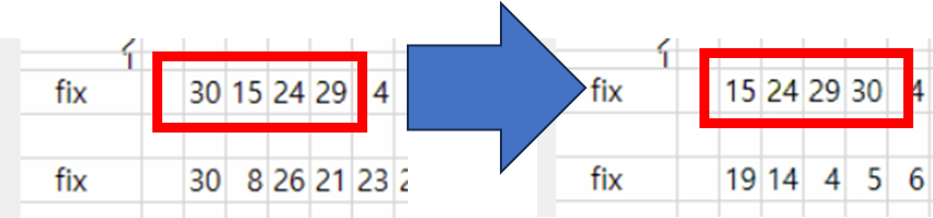 | Sub MD_Sort() Do v_Ch_Num = 0 For k = 1 To 3 If Range("C33").Offset(, k - 1) > Range("C33").Offset(, k) Then '값비교 'MsgBox Range("C33").Offset(, k - 1).Value 'MsgBox Range("C33").Offset(, k).Value 'MsgBox "앞에 수가 크다" v_val_temp1 = Range("C33").Offset(, k - 1).Value '각각 변수에 v_val_temp2 = Range("C33").Offset(, k).Value '값을 저장함. 'MsgBox (v_val_temp1 & "," & v_val_temp2) Range("C33").Offset(, k - 1) = v_val_temp2 '서로 값을 바꾸어 Range("C33").Offset(, k) = v_val_temp1 '입력함 v_Ch_Num = v_Ch_Num + 1 DoEvents Else End If Next k Loop Until v_Ch_Num = 0 End Sub |