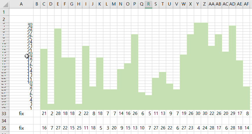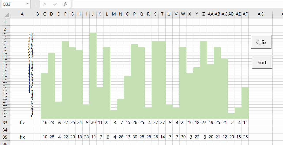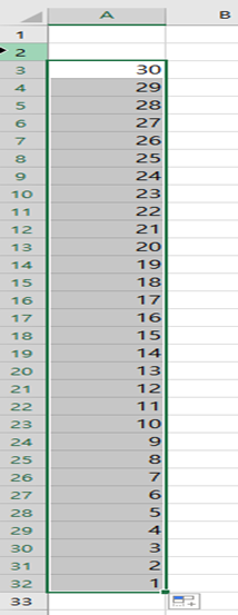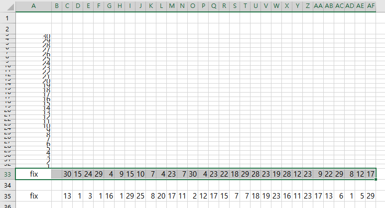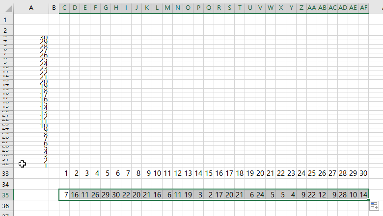 | C33에서 AF33까지 1에서 30까지 입력한다. |