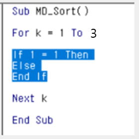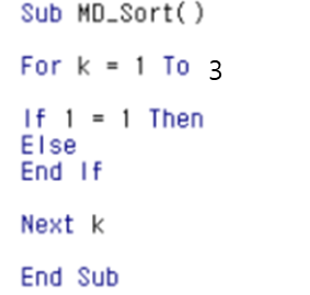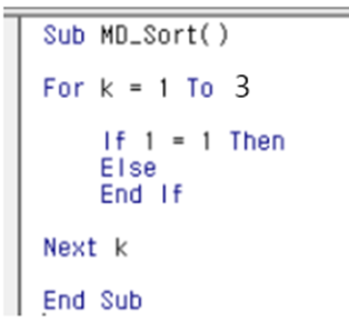 | 아래와 같이 for 구문, if 구문 입력 Sub MD_Sort() For k = 1 To 3 If 1 = 1 Then Else End If Next k End Sub |