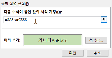 | 수식을 사용하여 서식을 지정할 셀 결정 | 수식칸에는 =$A3<=C$33 서식버튼을 눌러 채우기에서 적당한 색을 선택 |