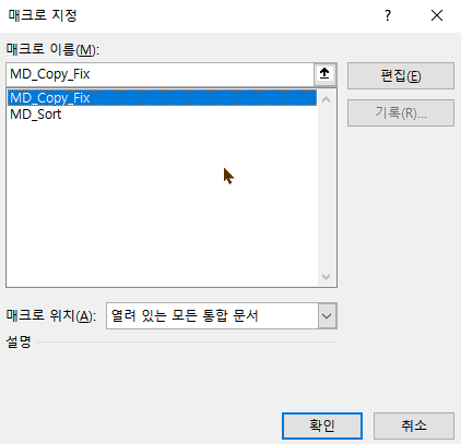 | 매크로 지정 창이 뜨면 Copy 매크로를 클릭 확인 |