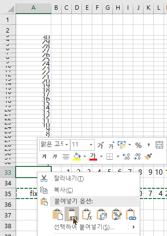 | 1) A33 셀 클릭 2) 마우스 우클릭 3) 선택하여 붙여넣기에서 값만 붙여넣기 4) ESC 키 클릭 5) B33셀 선택 기록 정지 클릭!! |