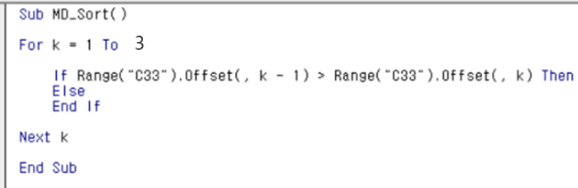 | Sub MD_Sort() For k = 1 To 3 If Range("C33").Offset(, k - 1) > Range("C33").Offset(, k) Then Else End If Next k End Sub |