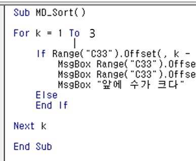 | if 구문의 then 끝에서 엔터 Tab 키 한번 클릭(들여쓰기) 후 입력 MsgBox Range("C33").Offset(, k - 1).Value MsgBox Range("C33").Offset(, k).Value MsgBox "앞에 수가 크다" |